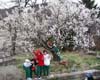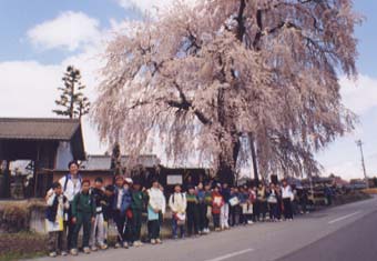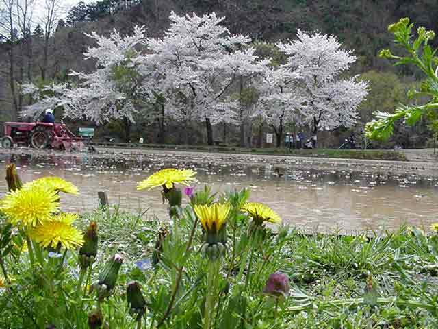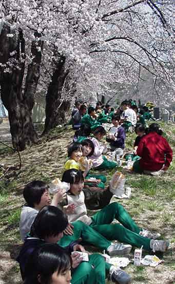 給食は、田んぼを見下ろせる満開の桜の木の下で食べました。 |