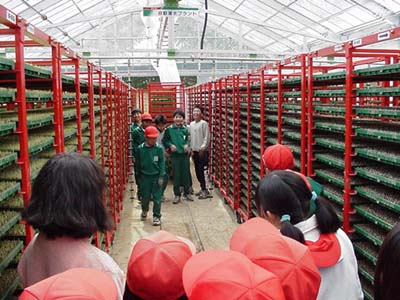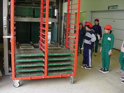 苗箱にスポンジのようなものを敷いて、その上に土を入れ、もみをまき、また土をかぶせる。これが自動的に行われます。それが、2日で芽を出し、温室で太陽の光を浴び、自動水やり機で霧状の水を浴び、どんどん育ち、出荷されます。