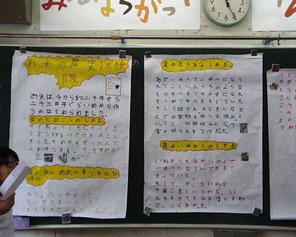 歴史探検隊は、昔の米作りの様子と今の米作りを比べて、道具や機械、農薬、などについて調べました。仕事の時間が大幅に短縮されたことに、みんなびっくりしていました。 |