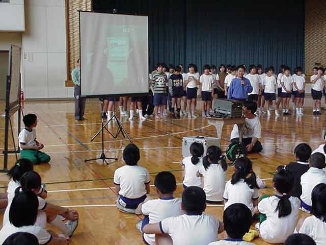 学校紹介では、豊玉東小学校の校舎の様子やパソコンで武石小から送った田おこしや代かきの写真を見ている様子などが、スクリーンに大きく紹介されました。代表で話してくれた男の子がとても味のある話し方で好感が持てました。