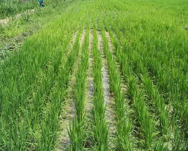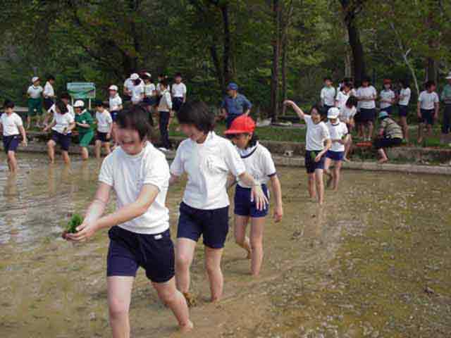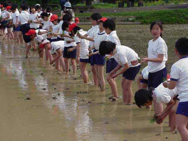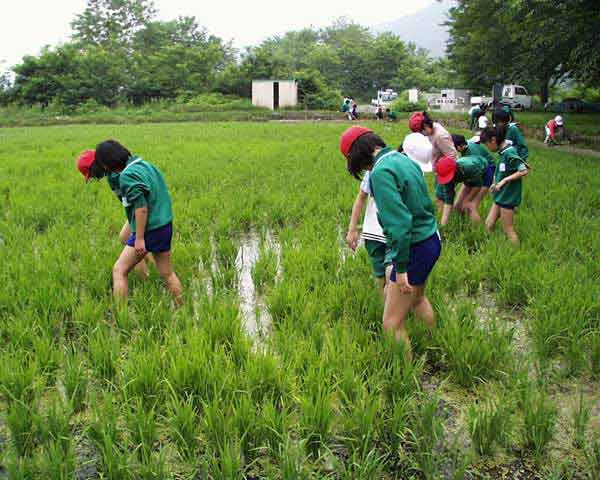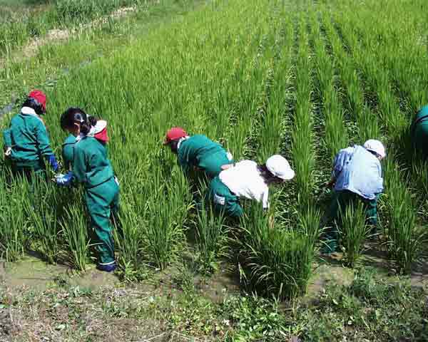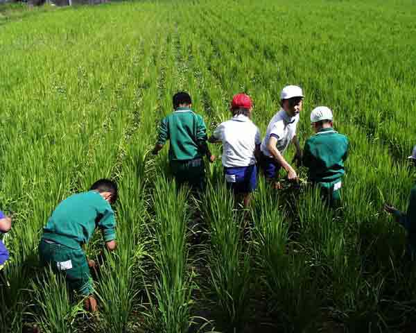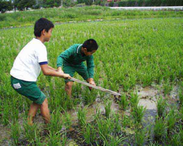 他の子どもたちも足で草を押し込みながら、田んぼの中を歩きました。