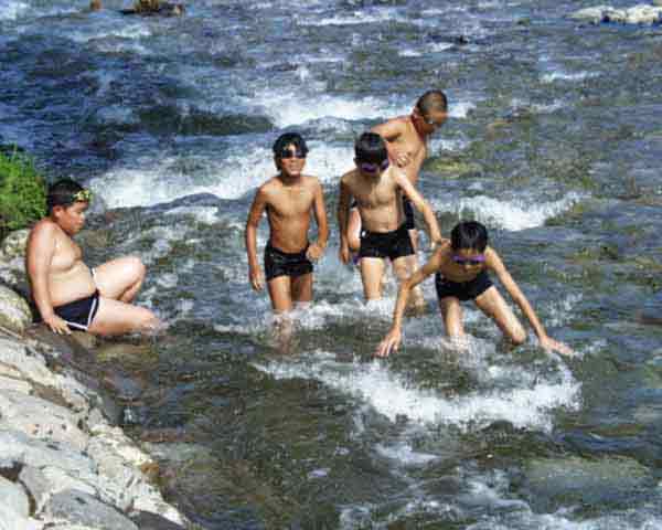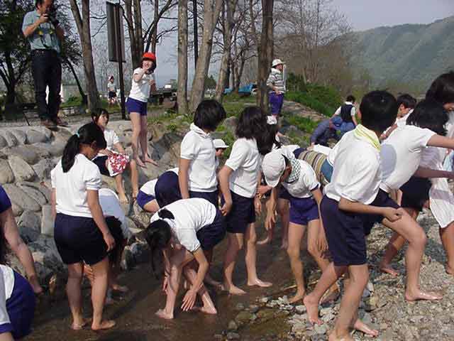 終わりには、カエルを追いかけてつかまえる子、川で足を洗ったり、黄鉄鉱をもらったりする子もいて、すっかり2つの学校の子どもたちがうち解けていました。帰りのバスを裸足で追いかけて、別れを惜しんでいる子どもたちや、バスの中から手をふる子どもたちの笑顔がうれしい交流会でした。 |