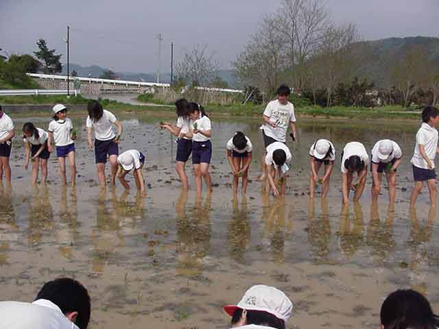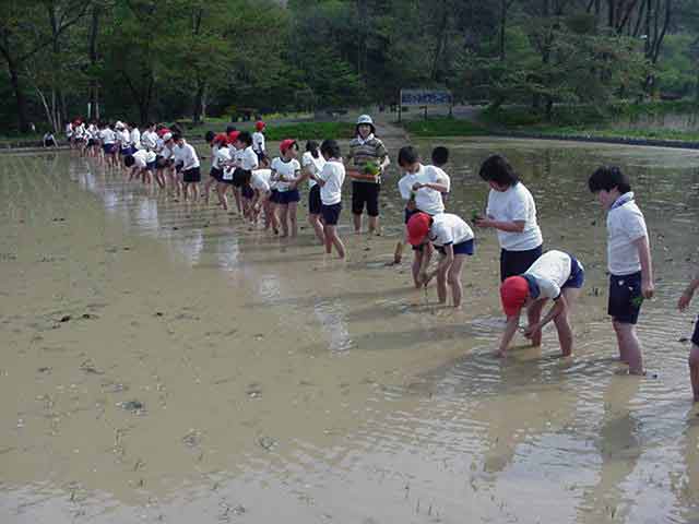いよいよ田植えです。最初は近づいて行かれなかった子どもたちも、作った名刺を渡したり、握手をしたりする中で、すぐに仲良くなり、ニックネームで呼んでいる人もいました。田んぼに裸足で入るのが初めての人がほとんどで、「うわあ〜。」とか、「気持ち悪い。」と言いながらも、田んぼの中を少し歩けば、慣れてきて、楽しく田植えができました。