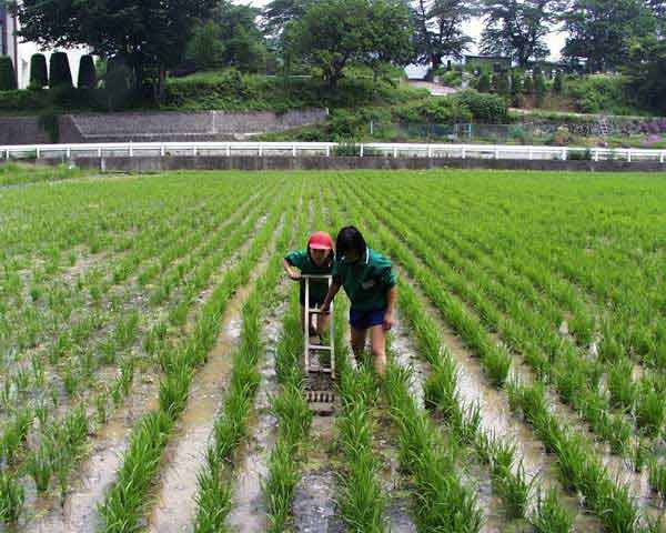 昔ながらの手押し草取り機を2台使って、貴重な経験です。深宮先生に教わって、イネとイネの間を50cmほど行ってはもどり、行ってはもどりしながら、草を土の中に埋めていきます。通り過ぎた後のイネの間は草が見えずにスッキリしていました。