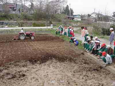 トラック2台分の堆肥と、200kgの「みつかね」(イネが転ばないように強くするための栄養剤)を田んぼにまきました。子どもたちは、「気合いだ!」と言いながら、スコップ、一輪車、バケツ、ざる等で田んぼにまんべんなくまくことができました。