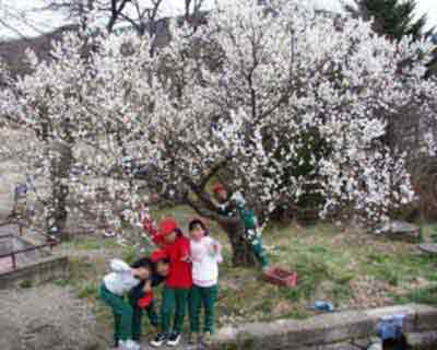 大堰(学校の中を流れる用水で、幅を広くしてある)の横にある梅の木が満開に白い花を咲かせていました。