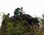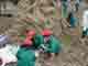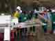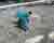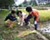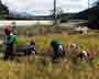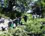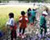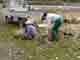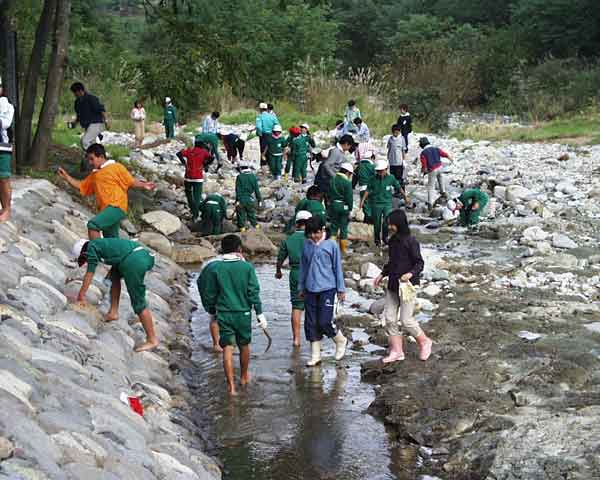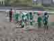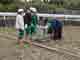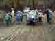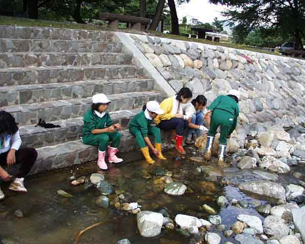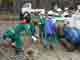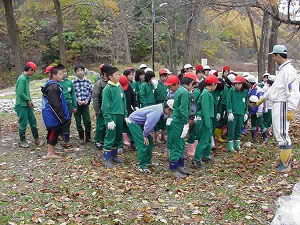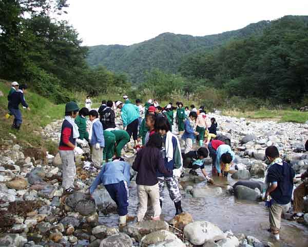 てこの勉強 武石川にある大きな石(500kgかな?)をなんとかして動かそうと、みんなで頭をはたらかせました。 「てこがいいよ。」という声がたくさんあったので、田んぼのはぜ棒を持って河原へ下りて行きました。5mほどの棒を石の下に入れて3人ほどで棒にぶら下がると大きな石が10cmぐらい動いて、大歓声。子どもたちは、短い2mほどの棒を手にいろんな石を動かし始めました。 |