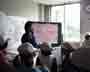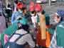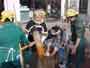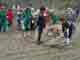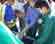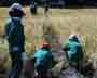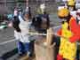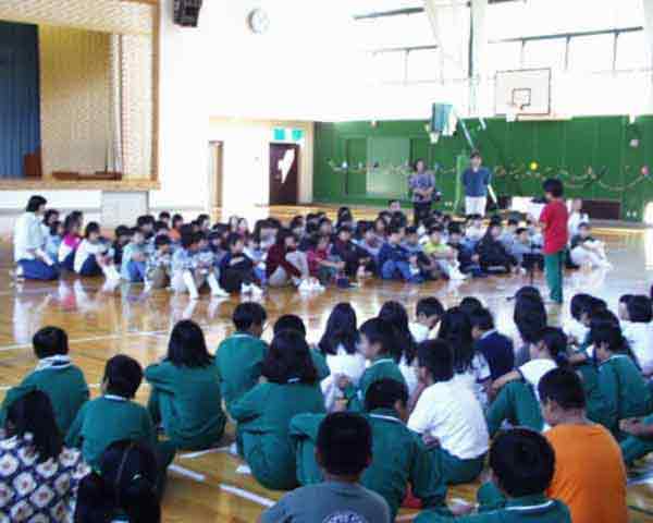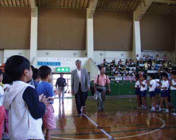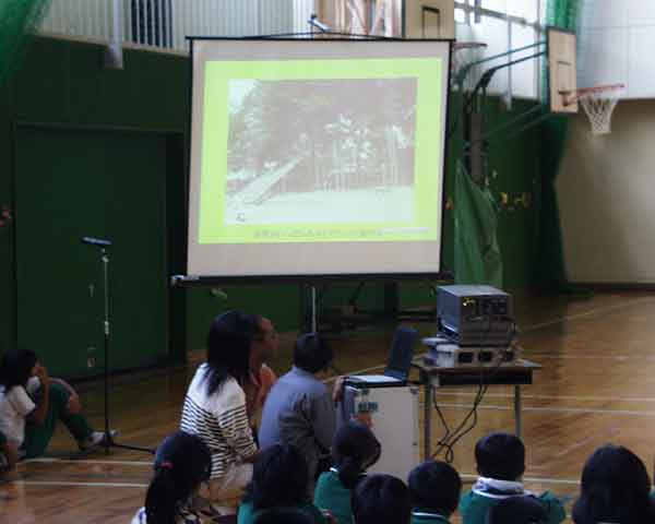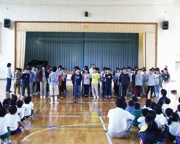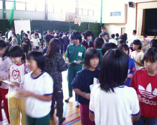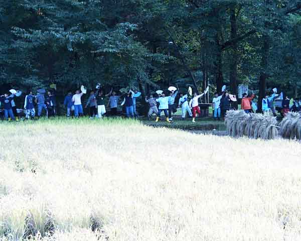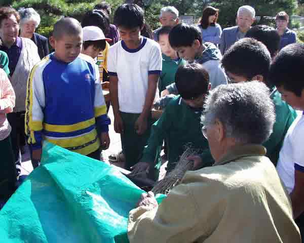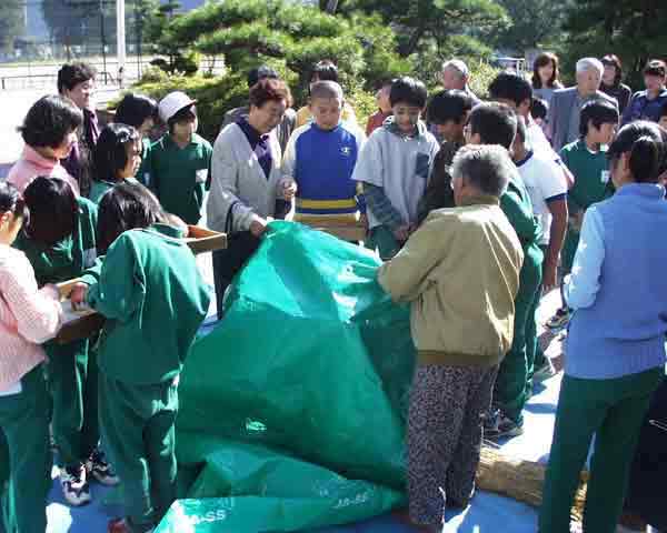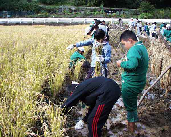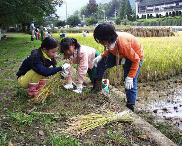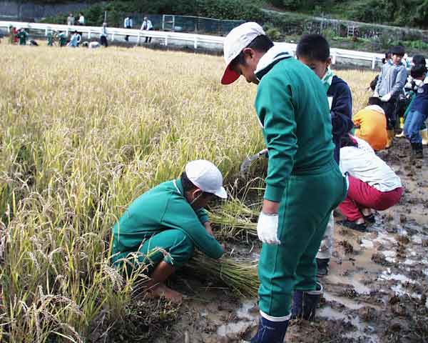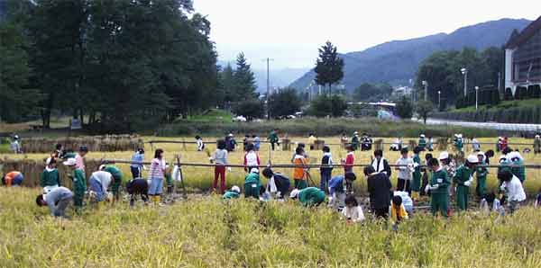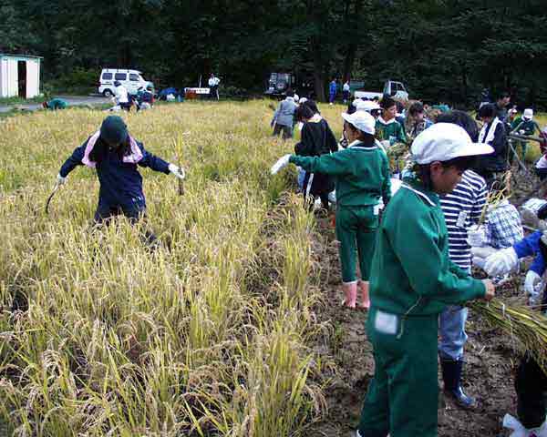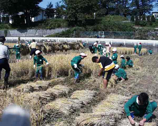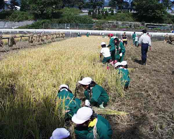稲刈り交流会 練馬区立大泉学園学校の5年生81名が武石小学校を訪れました。 メールで少し様子を知っていましたが、稲刈りを楽しみにしている感じが伝わってきます。 体育館に入場です。金管バンドの演奏と全校の拍手でお迎えしました。 みんなで♪まっかな秋♪を歌って、交流会が始まりました。 武石小学校の校歌を歌ったあと、緑小学校の学校紹介をパソコンとスクリーンを使って、分かりやすくしてくれました。 クラスの先生の紹介も似顔絵を見せてくれて、楽しかったです。 校長先生のお話の中に、武石小学校の中にきれいな川が流れているなんて、最高にすばらしい、というお話がありました。武石の水は本当に自慢できるし、これからも大事にしていかなければいけないなと思いました。 5年生だけ残って、稲刈りの説明をしました。 次に、名刺交換です。 手作りの名刺を交換したり、握手をしたりしていると、すぐに仲良くなってきました。 いよいよ田んぼへ移動です。 4人ほどのグループを作って、武石小学校の5年生が先生です。 稲刈りがまの使い方、束ね方、はぜかけの仕方など自分がまずやって見せていました。 緑小の5年生も、すぐにできるようになって、稲刈りを楽しんでいました。 前の日に降った雨で、田んぼに水がたまっていましたが、靴の上からスーパーの袋をかぶせたりして工夫して田んぼに入っていました。 よごれた靴は、すぐ横の武石川で洗います。 最後に収穫の喜びをこめた、御神楽を緑小の5年生全員が田んぼの周りで踊ってくれました。 田んぼに響く太鼓の音と、色とりどりの扇が舞う踊りに、稲刈りができた喜びが伝わってきました。 本当にすばらしい交流会になりました。 |