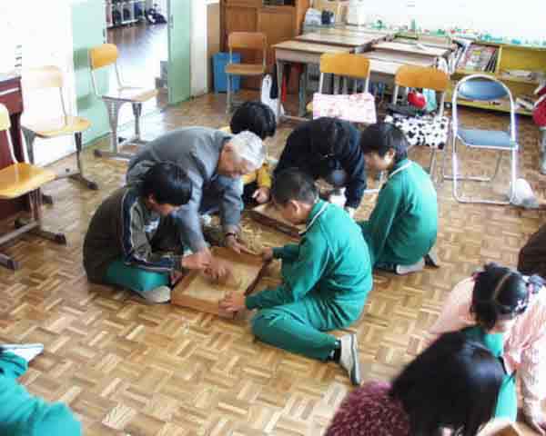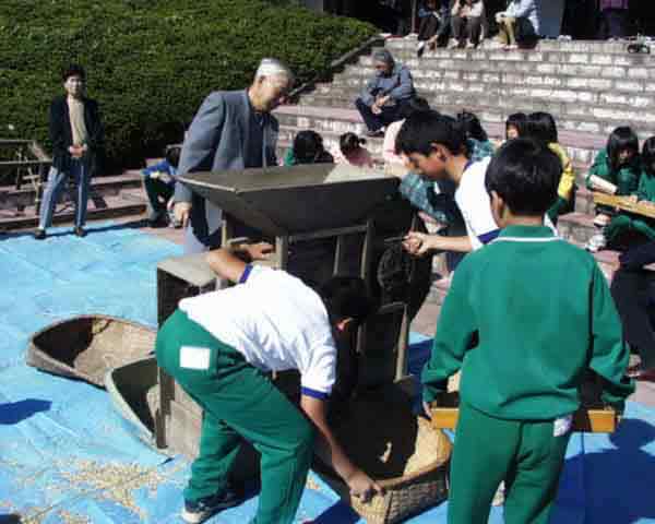 祖父母参観日 稲刈りの後から餅つきの白米になるまで、どのようにすればいいのか、考えたり、おじいちゃん、おばあちゃんに聞いたりしてみました。 おじいちゃんが、「昔は、足踏み脱穀機や千歯こきでもみを取って、とうみでわらくず等と分けたんだよ。」と話してくださいました。 まず、子どもたちの手でやってみようと、手でイネの束をしごき、もみを取りました。 そのもみを箱の中で木でこすり、もみがらを取ります。 できた玄米はペットボトルやビンに入れて棒でつつきます。 玄米の表面がこすれて、ぬかが取れ、白米になっていきます。 足踏み脱穀機でもみを取りました。 「うわ〜。速い。すぐに取れる。」 と、子どもたちもびっくり。昔の人の知恵に関心しました。 とうみで、わらくずや、もみがら、軽いもみを飛ばしました。 ハンドルを持って回すと風が起こって、上から入れたもみの混ざったものが風で飛ばされます。 これまた、昔の人の工夫のすばらしさに関心しました。 |