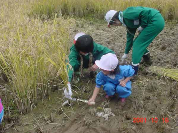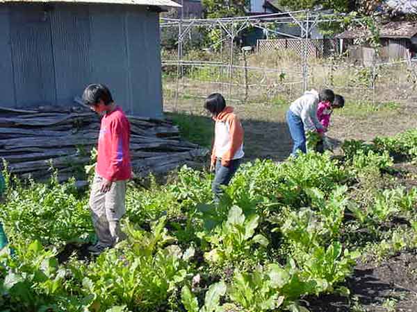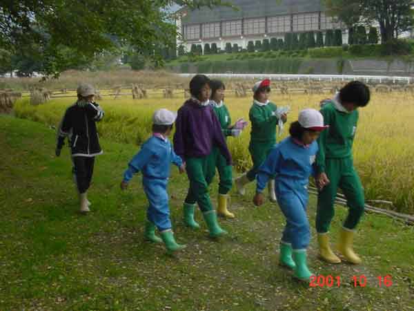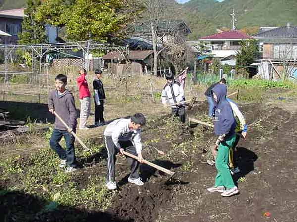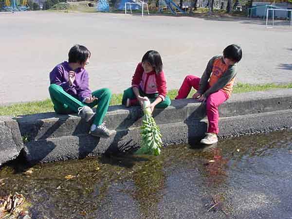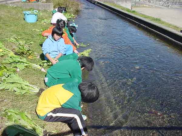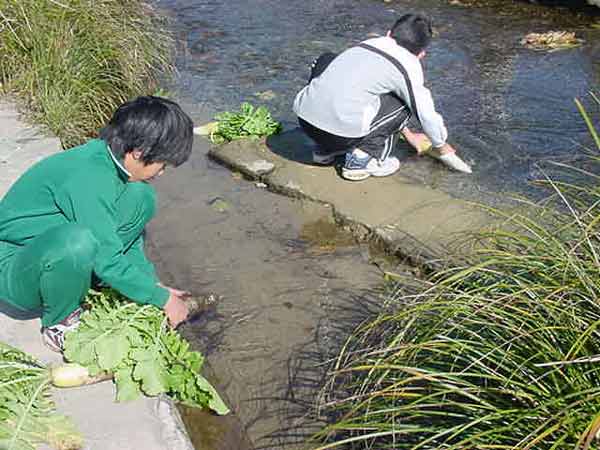 お菜洗い 畑の大根と野沢菜を収穫し、大堰で洗うことと、畑の冬越しをすることを分担しました。冷たい水でのお菜洗い、くわを使っての畑の冬越し、大変ですが、みんなでよくがんばってできました。 ![]() |