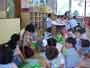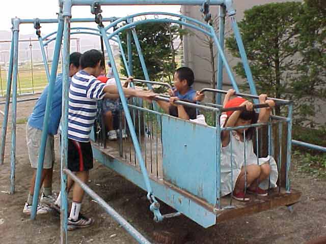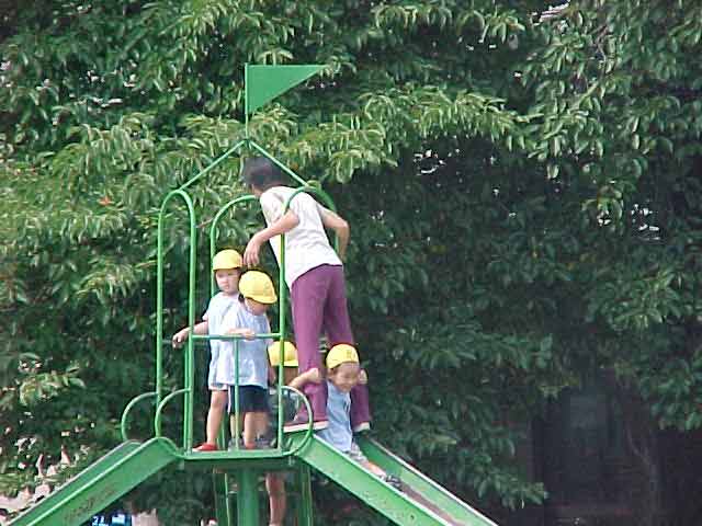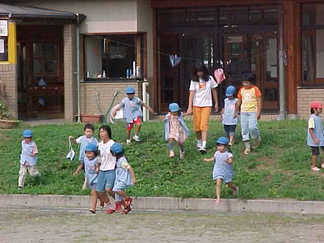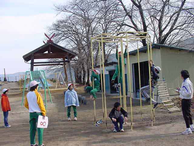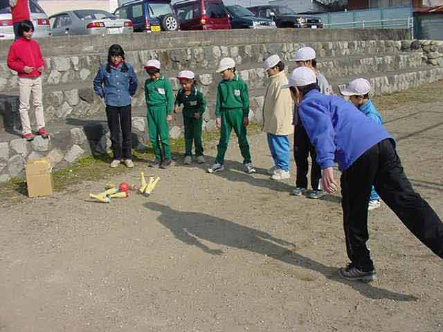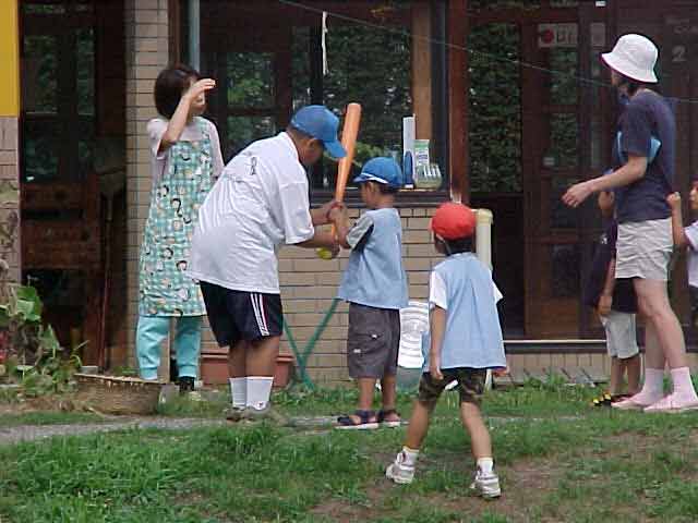 保育園体験 総合的な学習の時間の一環として保育園へ行きました。 子どもたちは、すぐに仲良くなり、名前を覚えて、いっしょに遊び始めました。 野球を教えている男子バットのにぎり方をやさしく教えています。 お兄さんは力が強い。楽しく保育園での活動ができました。 |