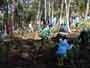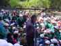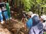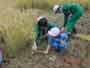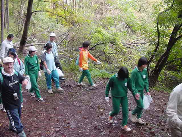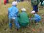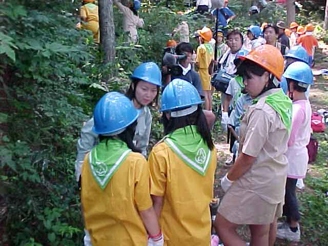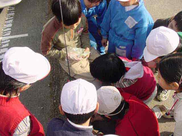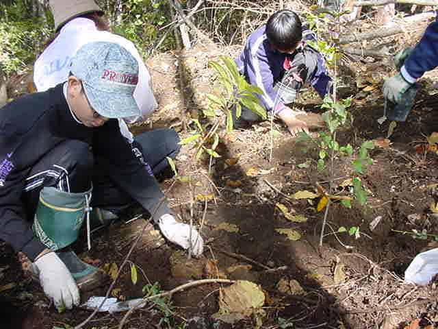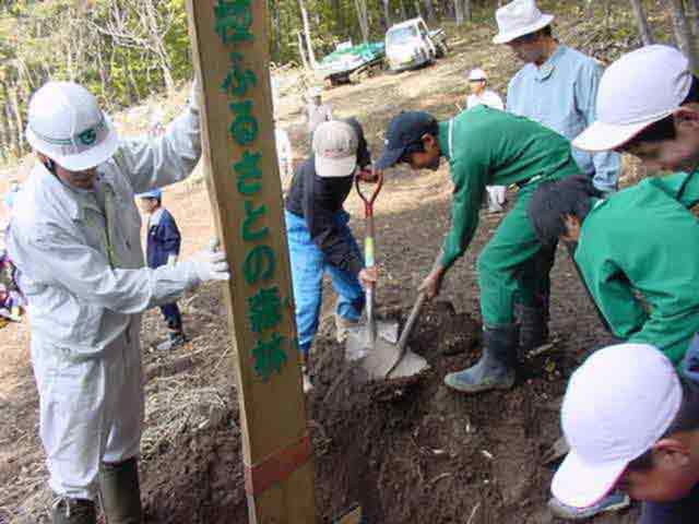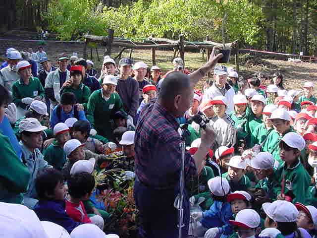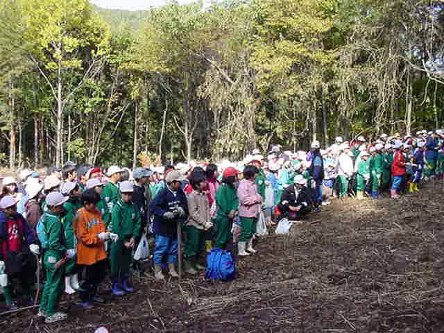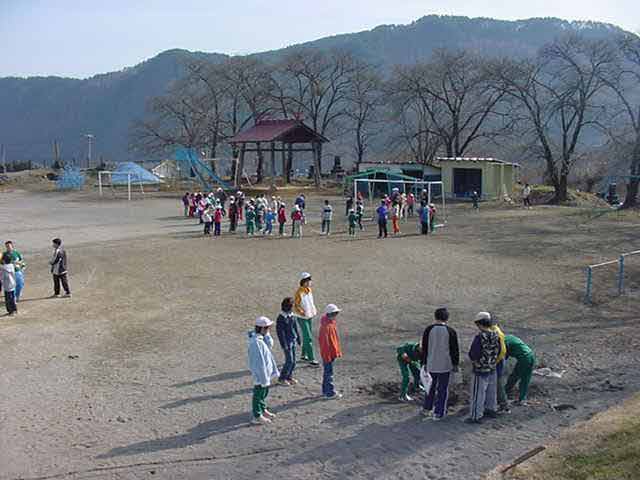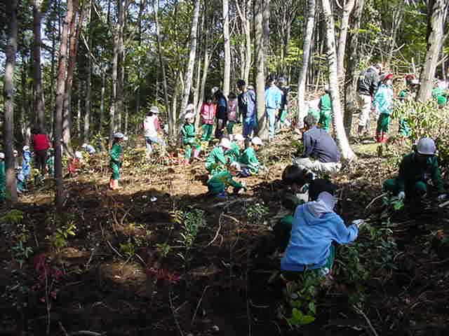 ふるさとの森林づくり 小学校の森を作ろうと全校児童で、コナラ、ミズナラ、クリ、エノキ、ヤマモミジ、シラカシ、ソヨゴ、などの苗木を2300本植えました。県自然保護研究所長の宮脇先生が、「木も人間も同じです。いろんな種類の木が個性を生かしながら、耐えながら、育っていく。人間もいろいろな個性の人が力を発揮し、耐えながら成長していってほしい。」と話されました。そして、その土地に合った木をいろいろに混ぜて植えて行きました。子どもたちからは、「早く育ってほしい。」「実がなったら食べたい。」「たくさん植えた。」などの声が聞こえました。 ![]() 開会式 植え方の説明を聞く 植林 標注を立てる |