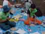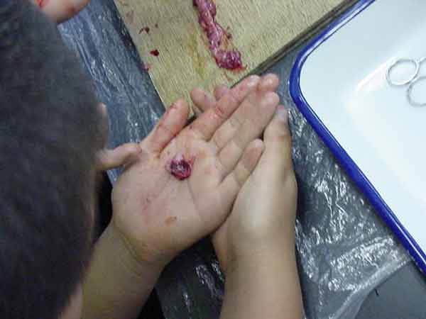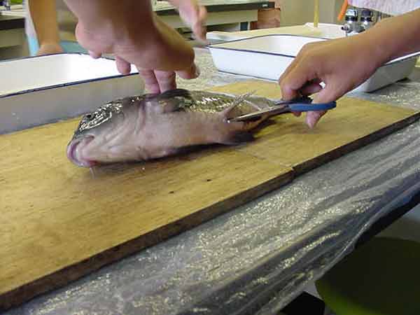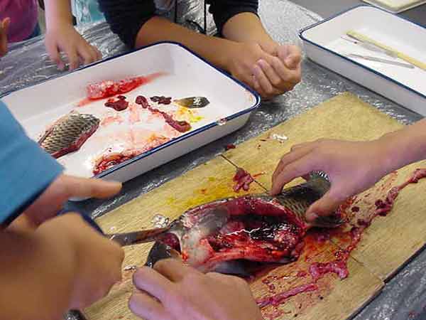 鯉の解剖 上田創造館へ行って、鯉の解剖とプラネタリウムの学習をしてきました。鯉は40cmはあろうかという大きな鯉でした。 子どもたちは、大きくて生きているので、最初は、おっかなびっくりでしたが、命を無駄にしないように、真剣に学習できました。 肛門からはさみを入れて、卵巣や白子、浮き袋と取り出していきました。腎臓や肝臓、胆のうを取り出し、えらぶたを切って、えらの様子を観察しました。 たんのうから緑の汁を出して、なめてみると、とてもにがかったです。最後に、心臓を取り出しました。まだ動いています。 小さな心臓を手のひらに乗せると、血液を送ろうと、まだ動いていました。生命の強さを感じることができました。とても貴重な、すばらしい体験ができました。 |