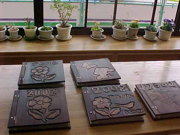 ずっと作り続けていたアルバムが完成しました。一人ひとりの思い出がいっぱいつまったアルバムで、表紙もがんばって、よく彫ったすばらしい木彫りの表紙です。いい記念になると思います。