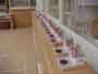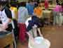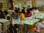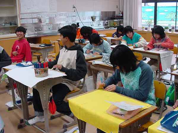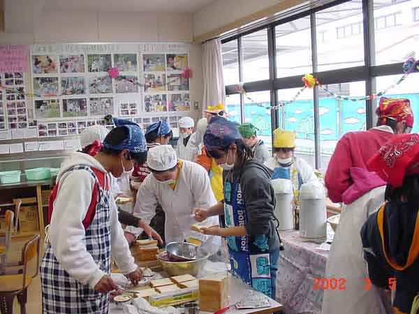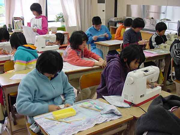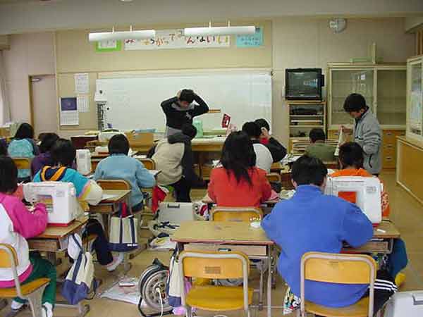 家庭科で一人一人が家族への贈り物を製作しています。マガジンラック、クッション、ティッシュカバー、おべんとう包み、手っ甲など、いろいろです。6年間の感謝をこめて、ミシンやアイロンを使って、がんばっています。 |