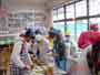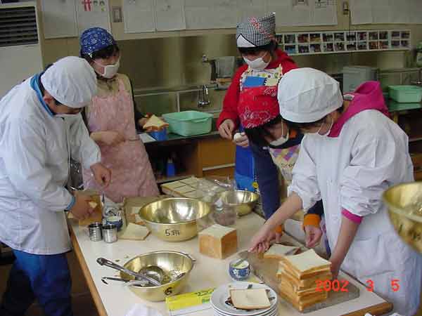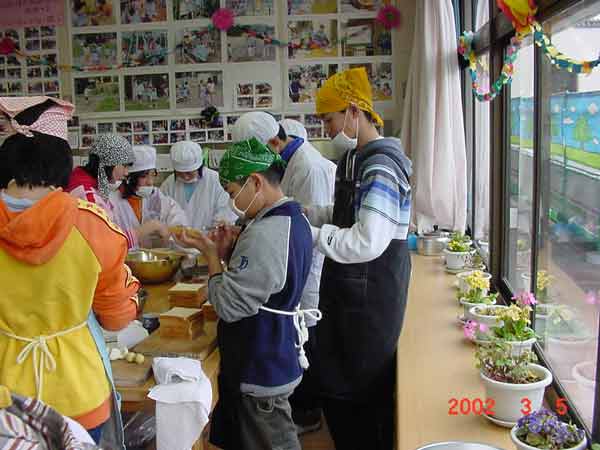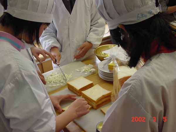 家庭科の学習で、卒業を前にお世話になった先生方をお招きして、会食会を開くことになりました。いろいろな役割を分担して、準備をしてきて、いよいよ今日が会食会です。教室をきれいに飾って、サンドイッチづくりをしました。調理室が校舎改築中につき使用できません。コンロを使わなくてもできるメニューを工夫しての学習です。