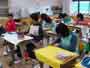 家庭科で、小学校卒業に当たっての、家族への感謝の気持ちをこめて、プレゼントづくりを始めました。それぞれ、クッションやアームカバー、お弁当包みなど、プレゼントする相手のことを考えながら作っています。
