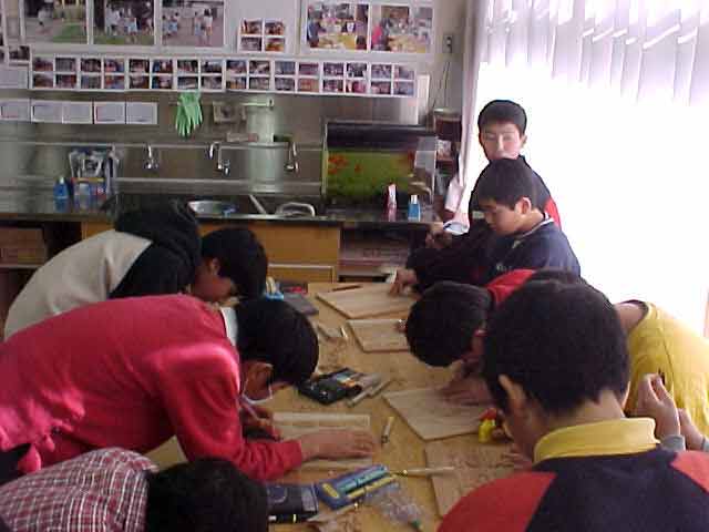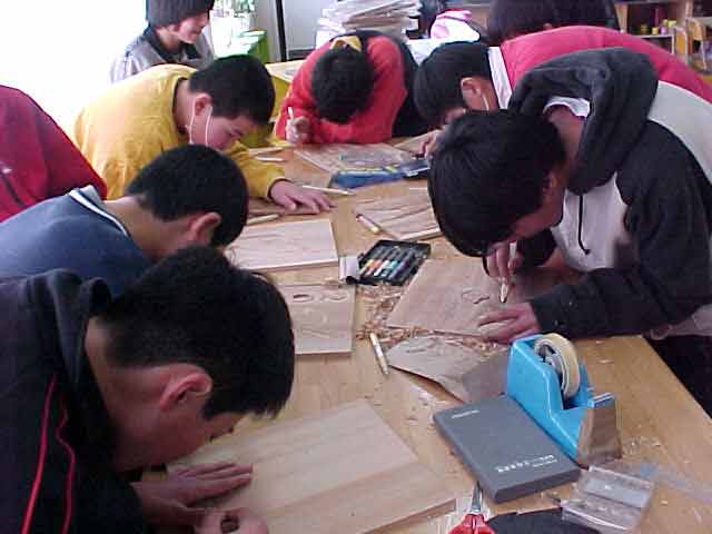 アルバム表紙を子どもたちが木彫りで作成し始めました。思い出のいっぱい詰まったアルバムの表紙をひと彫りひと彫り、思い出のように刻んでいます。きっとすばらしいアルバムが出来上がることと思います。 |