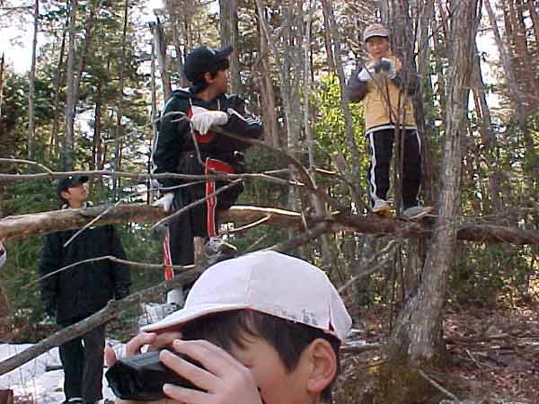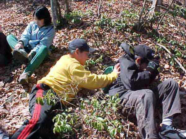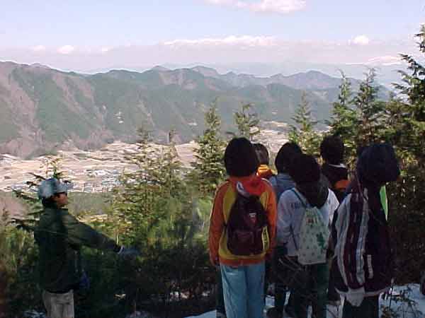 頂上北側から小沢根、市ノ瀬、うつくしの湯方面をながめる子どもたち