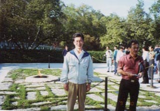 緑の芝生に、たくさんの白い墓が整然と並ぶ中、J.F.ケネディの墓が、消えることのない火と就任演説の碑文とともにあった。 |